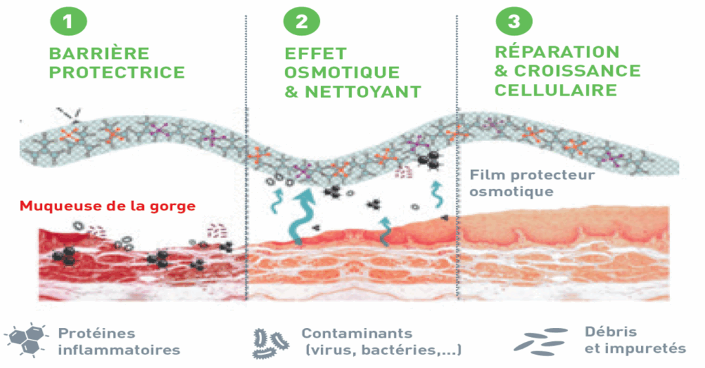 Cette barrière élimine les contaminants présents dans la gorge, grâce à son effet osmotique et nettoyant