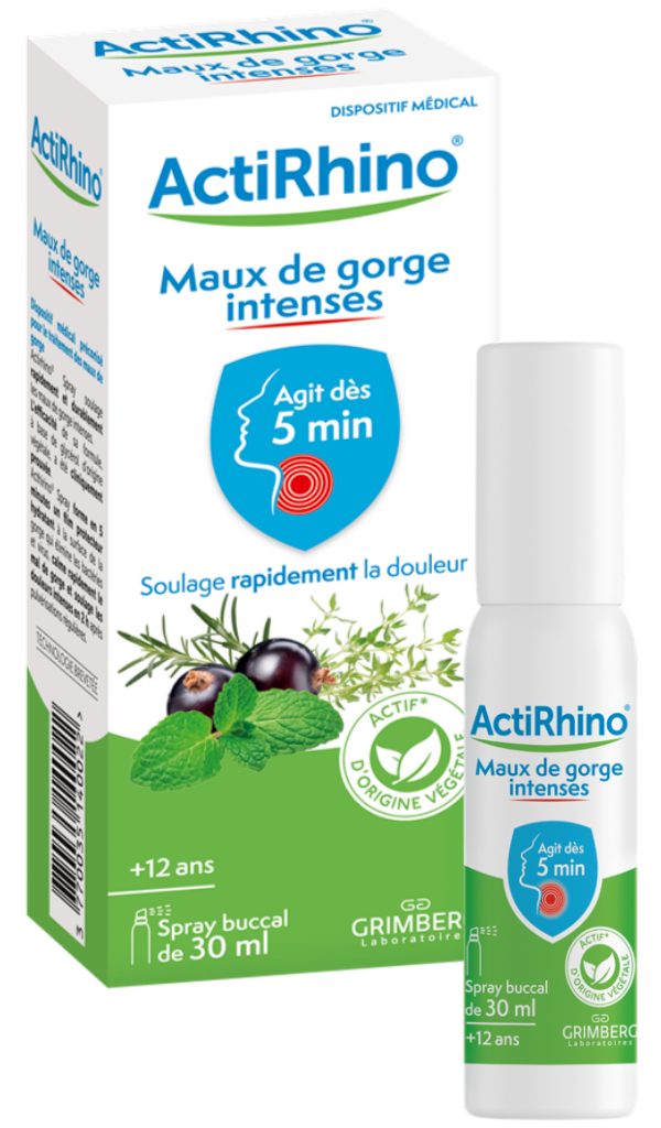 Le glycérol* associé au lierre grimpant et au cassis forme un film protecteur hydratant qui apaise les muqueuses irritées. Ces extraits végétaux sont également reconnus pour leurs propriétés anti-inflammatoires et antibactériennes. Actirhino® Spray Maux de gorge intenses permet de soulager rapidement la douleur et l’inconfort liés aux maux de gorge intenses. Dès 12 ans.